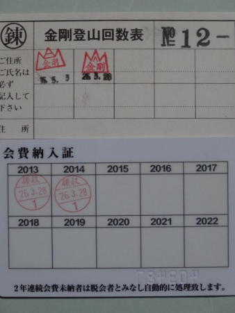 金剛練成会の登山回数表と会費納入証