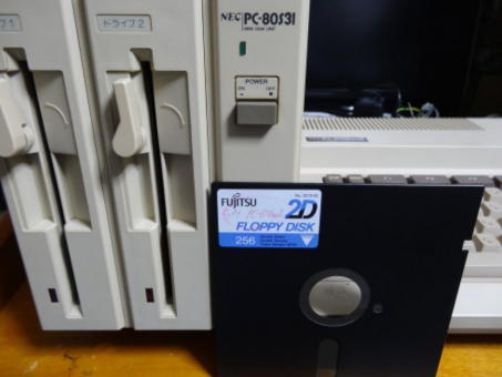 <2−1> 導入テスト1に引続き、今回はPC80S31を使用してCP/M49Kを立ち上げるために、cpm.d88ファイルをNDittで5インチの1DイメージでFDに書込みました。 写真1がそのFDとPC80S31です。 写真2は各機器の接続状態の写真です。 写真3が、CP/M49Kの起動画面です。 当然ですが、テスト1と同様に起動しました。