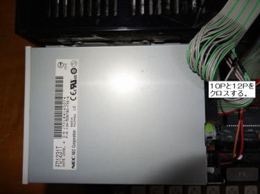 調査の結果、NDitt開発者のゆみたろう氏の「AT互換機のFDDを使ってみる」に辿りつきました。 記載手順に従い、CP/Mで使用するドライブ1をAT互換機と置き換え、写真4のようにフラットケーブルの10Pと12Pをつなぎ替えました。 従来のFDDはドライブ2としました。 組替え後の状態は写真1の通りです。