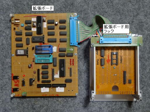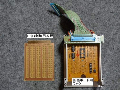 拡張ボード用FDD制御ボードは、写真1のように拡張ボードに接続して、ND80ZVのテストで使っていたラックがありますので、このラックを使用して写真2のようなラック用の基板に組み込みます。