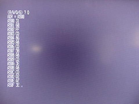 CのA500番地へのリロケートテストは、写真6の通りDコマンドでプログラムデータが正常に転送されていることが確認できました。 リード/ライトの機能チェックは、写真7の通り、適当にトラックNo3、 セクタNo1へCのリロケート先番地のA500番地から1セクタ分のプログラムデータを書込み、次いでそのデータをメモリの8000番地から1セクタ分を読込んだ結果をDコマンドで確認した結果、Cのプログラムデータがそのまま読込まれていることで、機能していることを確認しました。