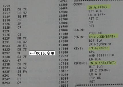 A 「CP/M 16〜18」で作成したシステム作成用ROMについて、MBIOS(「CP/M手作りマイコン3」のP166)の0237番地を写真9のように変更する。