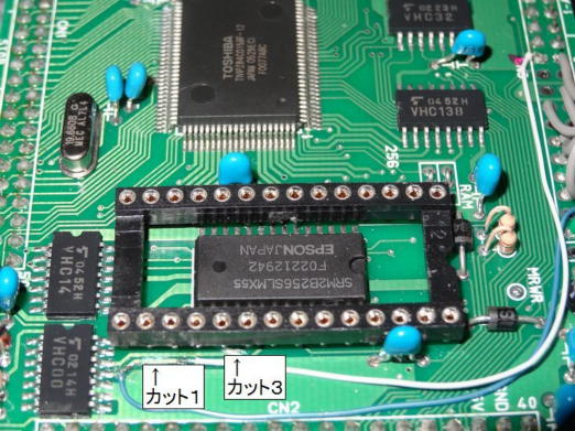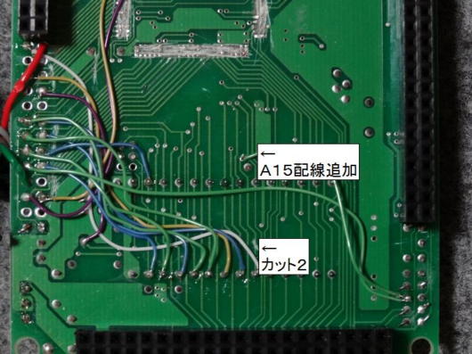 実は、予備テストで「AKI-80型CPUボード」がスムースに作動しなかったのですが、その原因を調べると、前回記載の写真5の基板カット部分のうち、カット2部分の目的(A15ラインをROMの20P:CSと完全に切り離す)を達成するためには、写真6のカット2部分の1っ箇所ではダメで、写真7のカット3部分もカットし、写真6のように配線を追加する必要があることが分かりました。