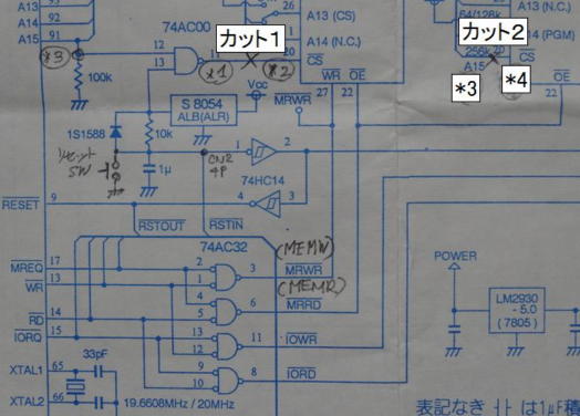 写真3は、前回記載忘れていました 20P:*1を追記で、写真4は上記の拡張ボードの利用目的のためCN4に追加した7P:ROM SELECT信号を作るための74HC32を追加した様子です。