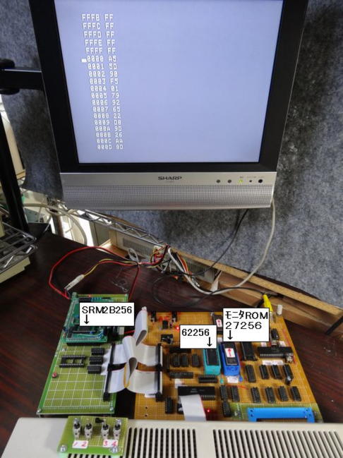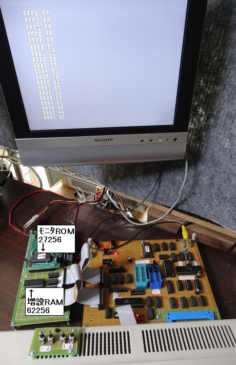 写真7は、拡張ボード上にあるRAM及びROMのゼロプレッシャーソケットへモニタROM及び増設RAMを移動させテストした結果です。 この場合も正常にプログラムは立ち上がり、正常に機能しました。