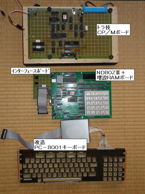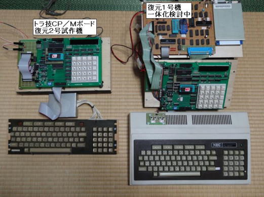 復元1号試作機でのCP/Mマシンの復元が思いのほかスムースに進み、その作業に集中していましたので、復元2号試作機については、モニタの打ち込みと起動確認までで作業が止まっていましたが、丁度、中日電工さんのCP/M講座も一段落しましたので、それに使っていた2台目のND80ZVで、復元2号試作機の原型をまとめました。 写真1が復元2号試作機の全体の構成ですが、ND80ZVは復元1号試作機と同様にトラ技ボードとの接続のための改造を行い、キーボードもPC−8001のジャンク品を入手し、専用のものを新たに作りました。