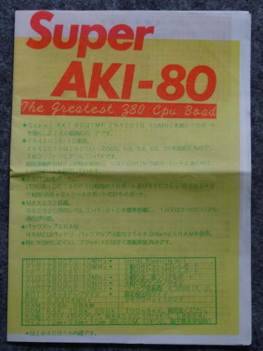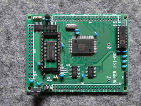 で、いちから作るのも良いですが、楽をするために何年も前に触ったことのある「AKI−80」を思い出し、今でも秋月さんが取扱っているかどうかを確認しましたところ、「AKI−80」は販売中止になっているようですが、 グレードアップした「Super AKI−80」(写真1、2)が組立完成として今でも販売されたいましたので、このボードを使って復元1号試作機のCPUボードを製作することにして、ゲットしました。