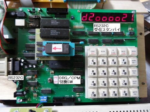 尚、ND80ZVのハード変更の結果、写真3のように以前電源スイッチに使用していたスイッチを、ORG/CPMバスの切換スイッチとして使っています。 因みに、ND80ZV専用モニタを使用するときは「ORG」へ、CP/MでRS232Cを使う時は「CPM」へ切り換えて使います。 RS232Cを実際に使い他のPCと交信する場合は、中日電工さんの「TK80モニタプログラム操作説明書」P28の例では、次のように使用しているサブルーチンもCE00Hのバイアスが必要です。