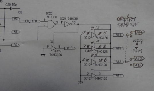 となっていますので、A14、A12、A8のみ反転すれば良いことが分かります。 このバス状態の切換は、スイッチを使い写真2の様にND80ZVのハードを変更しますが、この変更はメーカ保証が受けられなくなりますので、あくまでも自己責任で行ったください。 また、当方の中日電工さんの組立説明書では、写真2のように実際の結線と違っていましたが、ND80ZVとして使う分にはこのままで何の問題もありませんが、改造作業をするにあたっては、現在手持ちの組立説明書と実機を良く比較してください。