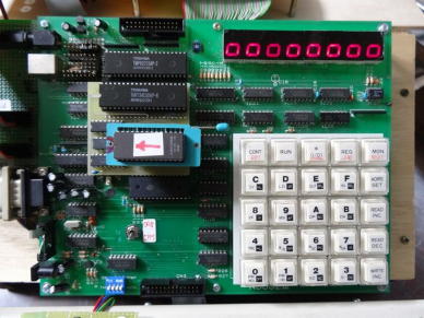 アセンブルで作成された「NDMONT4.bin」を「CP/M No35」でも説明しました転送用ROMのベースプログラム(APPLI_BASE..TXT)の 200番地に貼り付けて、前回同様に「転送用ROM」を作成します(但し、このプログラムの「0009番地」と「01F6番地」は実際に転送するプログラムのバイト数「01CF03」に変更することが必要です。)。 そのROMをND80ZVのROMソケットへ差し込みシステムディスクをFDDに入れ電源を入れるとCP/Mが立ち上がりますので、写真4のようにそのまま「MDMONT4.COM」でSAVEします。 続いて、写真5のようにNDMONT4RのSAVEを確認後、LOADし実行しますと、 写真6のようにND80ZVの7セグLEDが点灯しモニタが正常に起動しました。