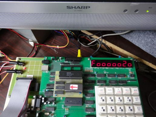 基本モニタは、ND80ZVのCP/M用のROMのモニタ部分を使いますが、そのままでは容量が300Hを越えますので、300Hに収まるようにプチ改造します。 写真1はプチ改造中のた基本モニタを起動させた直後の写真です。 写真2はモニタが起動したことを示す表示です。 やはり文字にアンダーバーが付いてきます。 何とかしたいと思っていますが、今のところ実害がないのでそのままにしています。