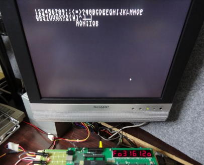 写真3はこのシステムのVRAM(F000H〜F1FFH)の先頭番地をアドレスセットしたところの写真で、7セグLEDにその結果が表示されています。 写真4は、適当な文字のアスキーコードをND80ZVのキーボードからダイレクトにVRAMへ入力して、CRTへその文字を表示させたものです。