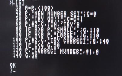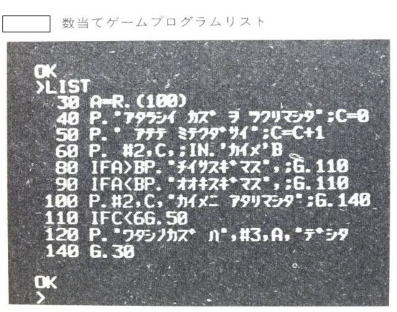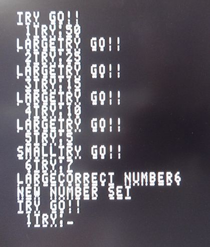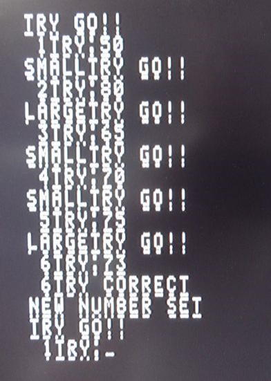 写真3がプログラムの入力を終え、LISTコマンドで確認している写真です。 このゲームはリストを見れば分かりますように、コンピュータが、乱数生成コマンドで100までの数字をランダムにセットし、人間は入力した数字に対して大きい(LARGE)か、小さい(SMALL)かのヒントを頼りに、6回までのトライでその数字を当てるゲームです。