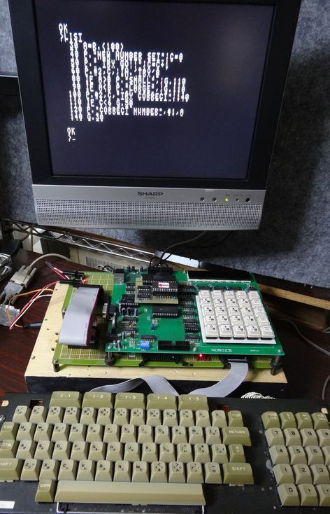 全体の機能をテストするために、写真1のようにI/O誌1997年12月号P92に記載されている、簡単なBASICゲーム「数当てゲーム」を試してみました。 現状では、エンコーダ付きPC8001改造フルキーボードが、カナモードに未対応のため、写真2のように一部変更しています。