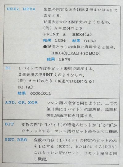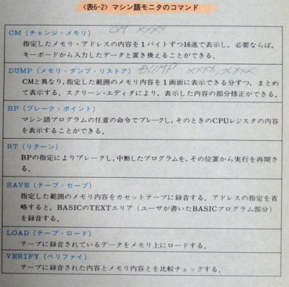 この仕様からも分かりますように、マシン語のモニタとしても使え、BASICとしても特有のコマンドがあり、しかもスクリーン・エディタも強力ですので、かなり面白いシステムとなりました。 デス。