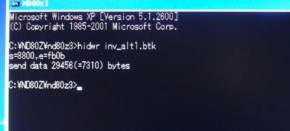 B 写真5は、移植用のプログラムをホストPCからND80ZVへ、USBを使って転送した画面です。 転送手順はND80ZVの取り説通りで、転送するファイル形式はBTKです。 転送は9600ボーでUSBで行いますので、一瞬です。 写真6がND80ZVの受信完了画面です。