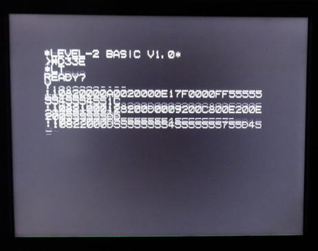 A 実に、のどかにトロトロと転送します。 転送エラーにならないか、チョット心配でしたが無事転送完了。 どうも、TVのビデオ入力端子が不調気味で、文字がダブって表示されるようになってきました。 転送後、TK80BSのBASICモードから、CALL 8900Hでスタートさせた画面が、写真4です。 正常に起動しました。
