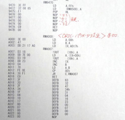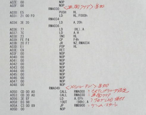写真5は、ゲームの初期化のルーチンとゲーム音おルーチンの例です。画面のクリアについては、BSではBS内のサブルーチンを使っていますので、NDでは、A030H番地に画面クリア・ルーチンを用意しました。