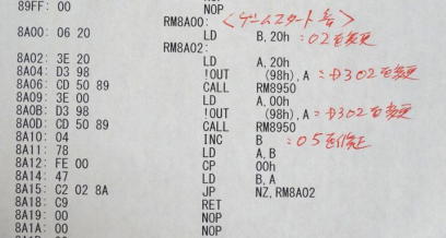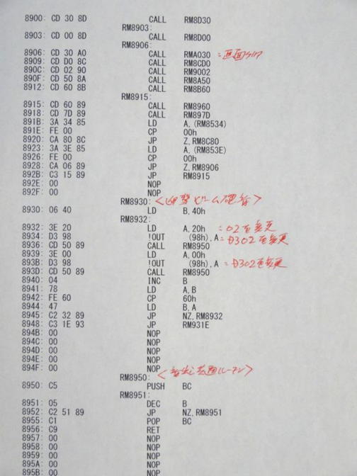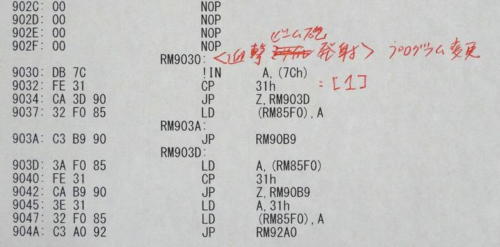 写真3がゲーム本来のメイン・ルーチンです。 迎撃ビーム砲の発射・ルーチンを写真4のように9030H番地に変更しています。当方のビーム砲の発射はフル・キーボードの「1」です。 9032H番地のデータを変更することで、好みのキーに変更できます。