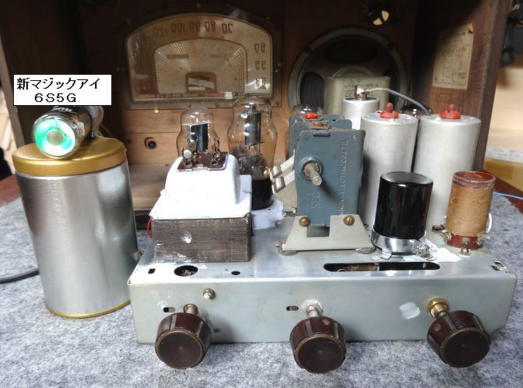 ブロックケミコン(32μFx2)とマジックアイ(6S5G)はラジオ少年で良いものが比較的安く手に入りました。 その他、パーツも割と揃っていていましたので、ダイヤルの糸やラグ端子、CRセットも購入しました。 今回は部品の調達と本体やボックスの掃除に手間がかかりましたが、修理、交換状況は次の通りです。