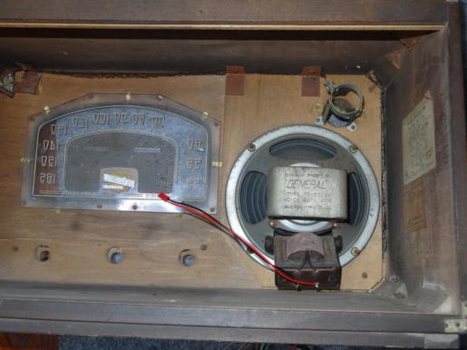 写真5は、取り外したスピーカで、コネクタは新たに付けたものです。 写真6は、上部に写っているのはダイヤル文字盤の縁取りの金具で、下に写っているのは、マジックアイ用の金具です。 何れも爪を曲げて(ヒンジ?)固定されていました。 写真7は取り外したダイヤルの文字盤です。