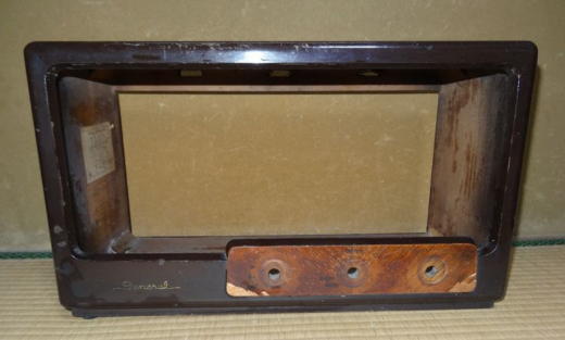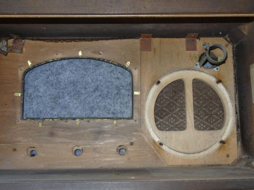 前面ボードに張ってあったサランネットはかなり劣化して汚れていましたので、はぎ取りました。 代わりのサランネットも調達しなければなりません。 もうひとつ豆球が2個のうち1個が切れていましたので、AC6.3V用のものを調達する必要があります。