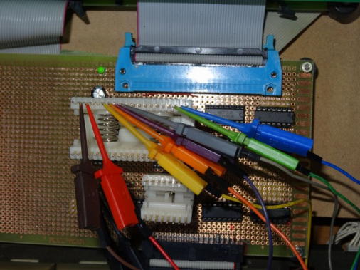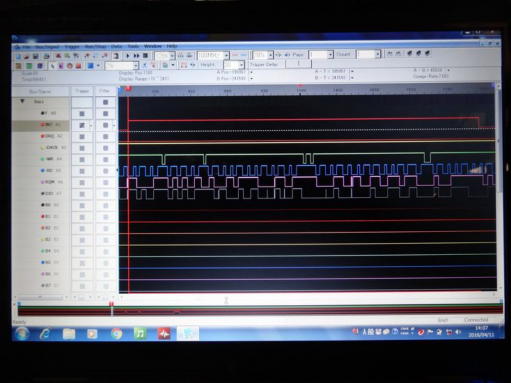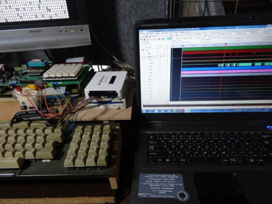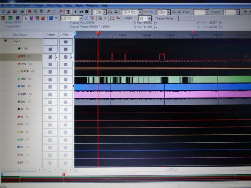 写真4は計測状況の全体で、写真5はμPD765Aの計測点の状態です。 写真6は、計測結果の一例としてINT(18P)をトリガーとして計測した結果ですが、この結果ではINT信号は4回計測されていますが、それ以降計測されておらず、ループに陥っている状況を示しているのではないかと思います。