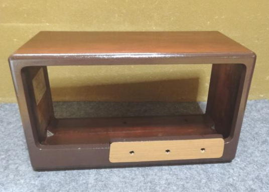 BOXの外装は前面部と縁取り部分は、マスキングテープを貼り、アトムサポート製の水性塗料、「アトムオールマイティ、コーヒーブラウン」を上塗りし、他の部分はアトミックス製の「アトム水性ニス、ローズ8」を上塗りしました。 何れもハケ塗りです。 ツマミ部分の化粧板がメクレテましたので、アサヒペン製の「木目調装飾シート、リアラ」を貼ってみましたが、色が明るすぎました。 これは、いつか貼り替えたいと思いますが、写真3が一応の仕上がりです。