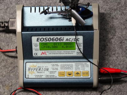 写真6は、昔お世話になった4#3bに付属のリポ1セル用(4.2V,500mA)のパワーサプライーを使用して充電をしているところです。 同様に写真7は定番のハイペリオンの充電器を使用して、300mAで充電を開始している状況です。 何れも問題なく充電できましたが、ヘリ内蔵のリポは65mAhですので、5Cぐらいまでで充電する方が安全ですかね。