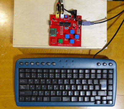 テストに使用したTVは、他のボードのテストにも使用しているPanasonicのTH-23LX70です。 組立てたMachiKania(写真1)との接続ケーブルはオーディオ用を使用し、PS/2キーボード(写真2)は在庫品から小型のものを探し出し使用してます。