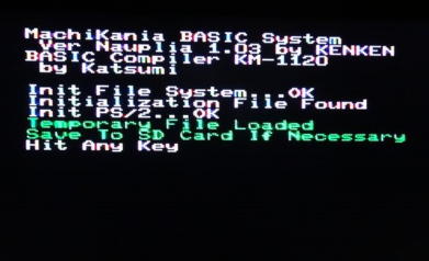 電源をいれると自動でブートローダが立ちあがり、ゲーム一覧と、MachiKaniaのBASICが選択できる画面(写真3)が表示されました。 先ずは、MACHIKANを選択すると写真4のようにBASICコンパイラが立ちあがります。 写真5はMUSIC.BASを覗いてみた画面で、RUNさせますと写真6の画面が表示されましたので、選択して実行させますと、サウンドとして聞くことができました。 引き続き、ブート起動して、それぞれのゲーム(写真7〜12)を一通り楽しませていただきました。