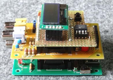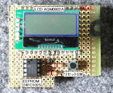 プログラムを作成してテストするためには、24FC1025等のEEPROMは必ず必要ですので、これも「EEPROM IC情報」を参考に写真2のようなEPPROMボードを製作しました。 スペースに余裕がありますので、ついでにI2C接続小型LCD AQM0802AとリセットSWを載せました。 完成した3つのボードを合体させた状態が写真3、4です。