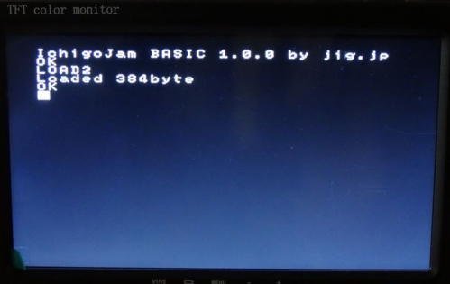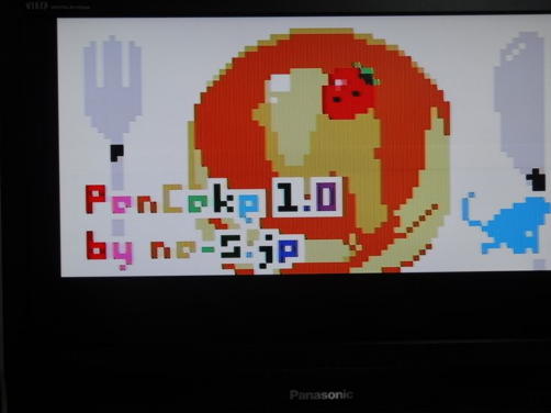 動作テストは、IchigoJamには7インチの液晶モニタ、USB電源、PS/2キーボドを接続し、PanCakeには、24インチTVのオーディオとビデオをそれぞれ接続して実施しました。 IchigoJamの電源スイッチを入れると、写真5のようにIchigoJamnの起動画面が7インチモニタに表示されると同時に、写真6のようにPanCakeの起動画面が24インチTVに表示され、スピーカから起動時のメロディが聞こえてきました。