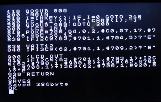 写真7のようにプログラムの入力テストを「LCD接続方法」に準じて入力し、正常に起動することを確認しました。 引き続き、SAVE、LOADの機能が正常に働くかテストした結果は、写真8、9の通りOKでした。 リセットSWも正常に機能しましたが、LCDが上手く機能せず全く表示できない状態です。 ハード的には簡単な配線ですので問題ないと思いますが、I2Cなるものが良く分かっていませんので、調査中です。