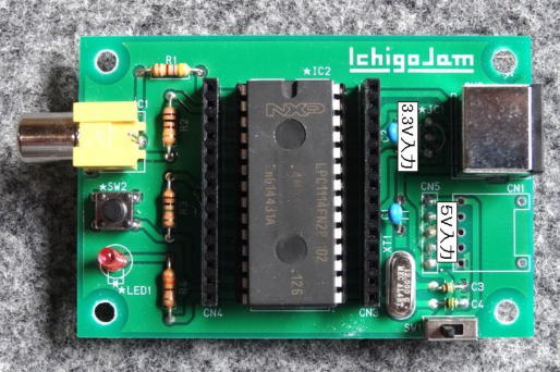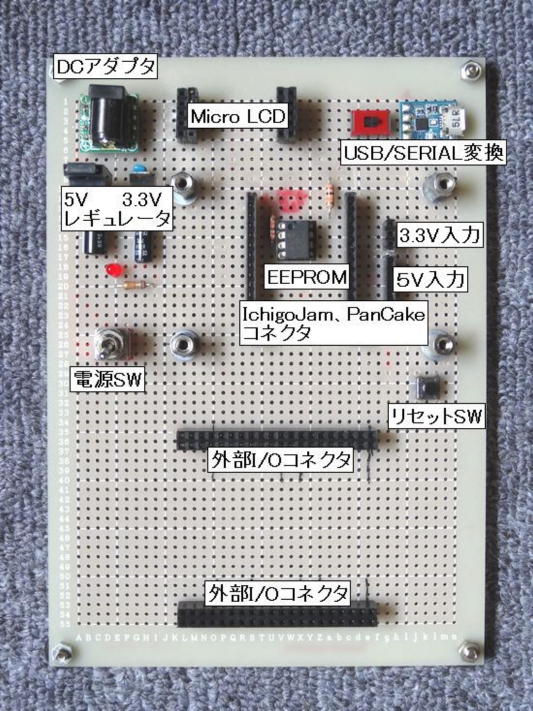 写真5は、「IchigoJamマイコン基板1」を参考に製作したトレーニングボードです。 Micro LCD用コネクタ、USB/SERIAL変換モジュール、EEPROM、外部I/Oコネクタ等を取り付けました。 3.3V及び5Vの電源は全てテストボードから供給します。 IchigoJam基板はこのボード用に追加購入したもので、ピンソケット(14P)は、PanCake用の足長を使っています。
