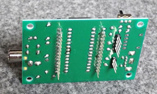 IchigoJam基板へは、テストボードから電源を供給しますので、標準の3端子レギュレータとマイクロUSB端子は使用せず、写真6のように電源供給用のピンを追加しています。 写真7が裏面で、このボード用に変更したピンの状況です。