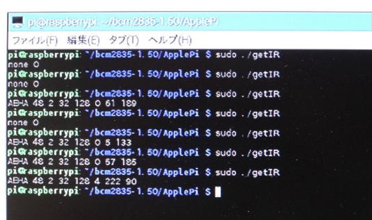 写真8は、赤外線リモコン信号の受信テストを、Panasonicテレビのリモコンを使って実施した結果です。 コマンドは次の通りです。