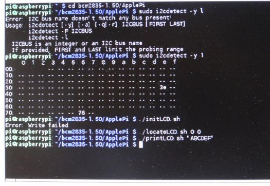と、入力すれば、写真5のようにLCDのI2Cスレーブアドレス 3e、センサモジュールのI2Cスレーブアドレス 76 が表示されました。 何とかApplePi基板は正常に機能しているようです。 一安心です。