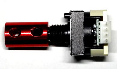 写真6は、ロータリ・エンコーダ関連のパーツで、ジョイントはいろいろ探しました結果、アルミシャフト「異径ジョイント3mm-6mm」をアマゾンの「NextHome U-Shop」の通販で購入しました。 ケーブル付きのハーネスは、自作もできますが購入しておいた方が無難です。 写真7がアセンブルした状態で、写真8がギアモータ左部と連結した状態です。