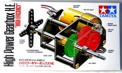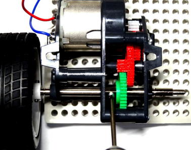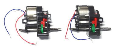 ギアモータのギア比は「64.8 : 1」で使用し、組立説明書の通りに組立てれば問題はありませんでした。 写真4が組立完了品で、写真5がシャーシへ仮り付けした状態です。