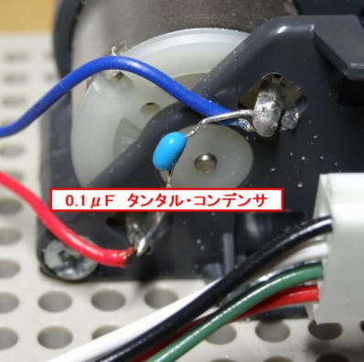 写真9は、シャーシ部にギアモータア左右センブリを取付けた状態の写真です。 ギアモータ左右の電源端子部には、ノイズ防止用のタンタル・コンデンサ(0.1μF)を取付けてました。(追加写真)