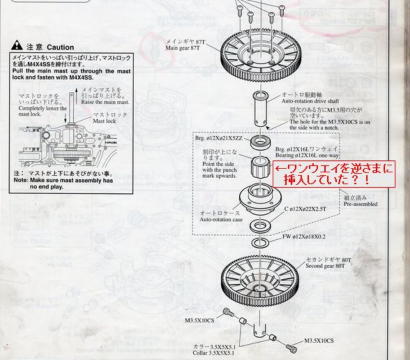と、会長さんがメインロータを回しながら、「ワンウエイが逆ですね」と指摘(写真5)。 確かに引っかかりが逆です。 メインギア関連も交換していましたので確認。 逆でした。