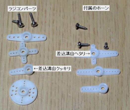 また、写真6のような付属のホーンが入っていましたが、写真では分かりづらいのですが、差込溝山がヘタっていてサーボが空回りするため使い物にならず、手持ちのヘリ用のパーツを使用しました。 ヘタリの原因は、成形用の金型がマトモデないためと思います。 (中華製のノーブランド品では良くあることですので、テスト的なものには承知の上で使ってます。)