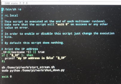 ついでに、安全にラズパイを停止させるために、トラ技2016年11月号 P108に従い写真7のように起動制御ファイル(/etc/rc.local)に手を加えて、シャットダウン機能の関するPythonスクリプト(shut_down.py)が自動的に起動するようにしました。