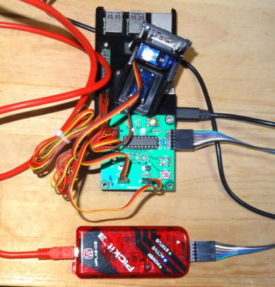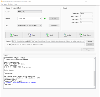 ダウンロードしたプログラムの中にHEXファイルも含まれていましたので、早速試してみることにしました。 HEXファイルですので、いきなりですが写真4の「MPLAB IPE」で書込んでみることとし、写真5のように制御ボードへPICKit−3を接続し、PICの電源はラズパイから供給する方法で試してみました。