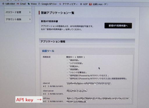 登録後にマイページ(写真13)のメニュー「API利用申請・管理」をクリックして登録した「雑談対話API」のAPI keyを取得しました。
