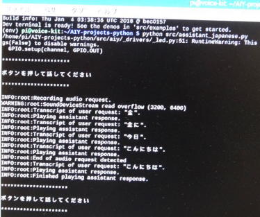 次いで、Voice kitに標準で付属しているサンプルプログラムを実行し問題なく機能することを確認しました。 このステップでは、まだ英語での対応です。