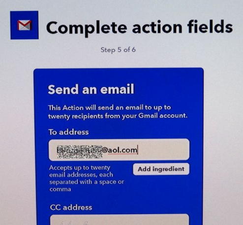 <ステップ4> ステップ4に戻り、「IFTTT」サービスとの連携について、同誌に従い Voice KitからGmailを使って音声をテキストに変換して、AOLの自分あてにメールを送るテストを実施しました。 IFTTTは初めて利用しますので、先ずはアカウント登録をしてから、同誌の「図10 IFTTを利用するための作業手順」に準じて、「Applet」を作成し、triggger、actionを設定しました。