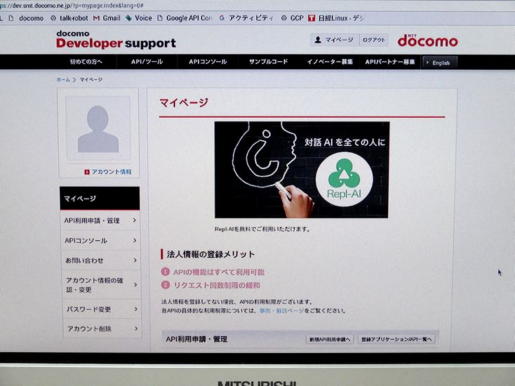 <ステップ5> NTTドコモの「雑談対話API」と連携して、シナリオのない雑談での会話機能についてテストしました。 「雑談対話API」を利用するにも先ず、「docomo Developer support」のアカウント作成ページにアクセスして登録し、同誌を参考に写真12のように「新規API利用申請」等、かなり面倒な一連の作業を済ませました。