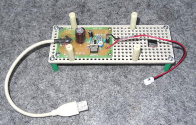 安定化電源基板は写真3のように組み立て、バッテリにつなぐためのUSBコネクタと、DCモーター制御ボードへ3V電源を供給するためのコネクタを接続しました。 出力電圧3Vは、基板上の電圧調整用VRで設定します。 この基板を取り付ける位置に迷いましたが、写真4のように、バッテリ搭載用プレートの下側になる位置へ取付けることにしました。 モーター用の電源は、単3アルカリ電池2本を直列に接続したものでも使えます。